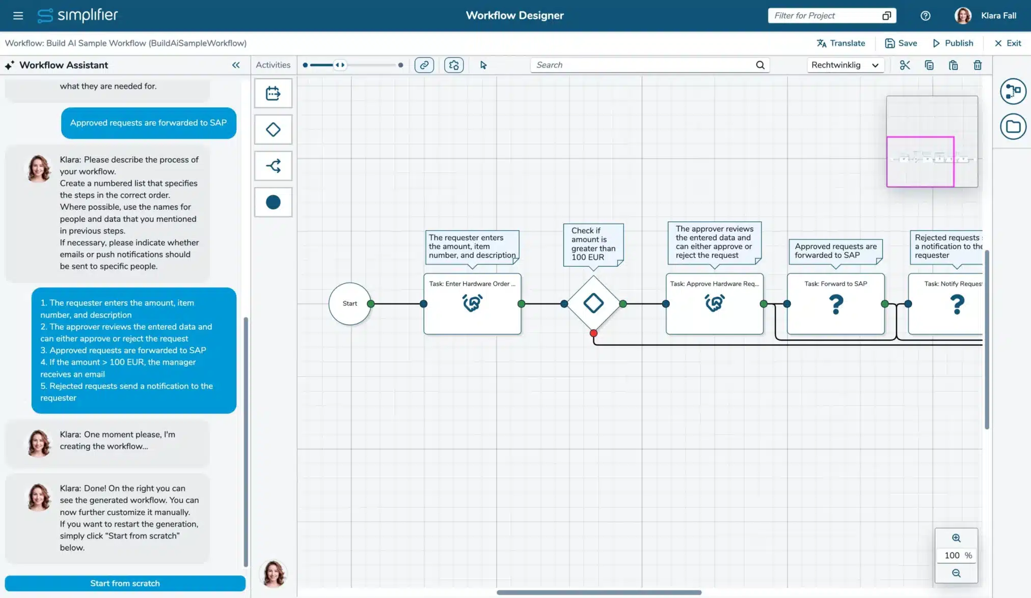 In the Workflow Designer, you will now find our new AI chat in the left sidebar. You can start a conversation with Klara and describe the workflow you want to create. It can create essential elements such as start and stop forms, user tasks, late decision tasks, and conditions with predefined operand types. (Read more)